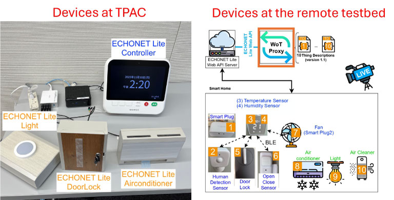 エコーネットコンソーシアムが用意したECHONET Lite Web API対応サーバ機能および同APIへの自動変換機能を搭載したWoT の Thing(デバイス)に対して、W3C会員企業3社が用意したWoTの Consumer(アプリケーション)が接続し、同Consumerから同Thingを介して物理的なデバイスを制御できることが確認できました。