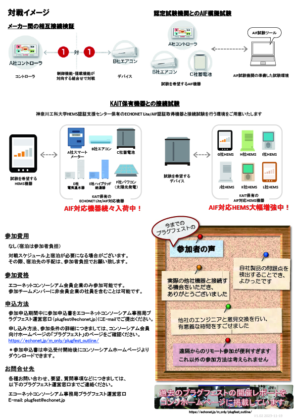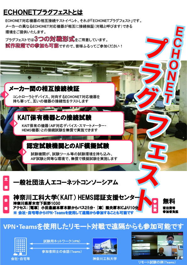 ECHONET Lite搭載製品の相互接続性の向上を目指し、製品や技術を持ち寄って相互接続試験を実施できる場のことです。プラグフェストには、エコーネットコンソーシアム会員(学術会員含む)が参加できます。