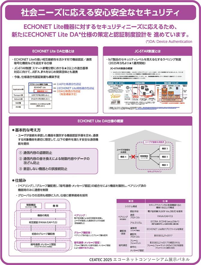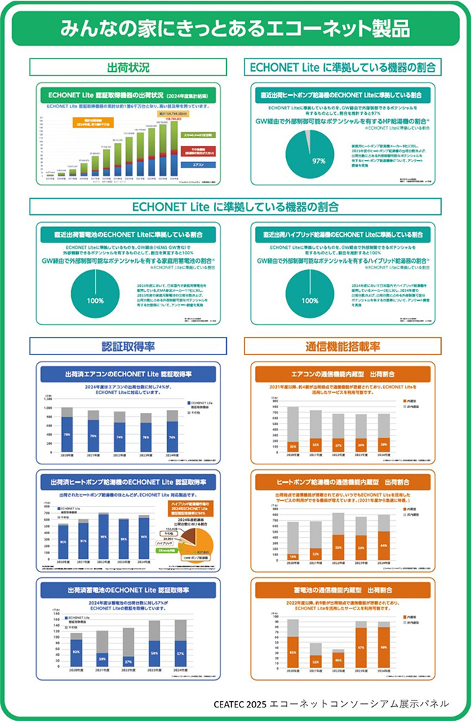 エコーネットコンソーシアムのブースでは、「みんなの家にきっとあるエコーネット製品で、新たなサービスが始まります。」をテーマに、ECHONET Liteの普及状況や、活用が進むECHONET Lite Web APIの紹介、カーボンニュートラル実現のための子育てグリーン支援事業やDRreadyへの対応、セキュリティへの対応など、最新の活動をご紹介しました。