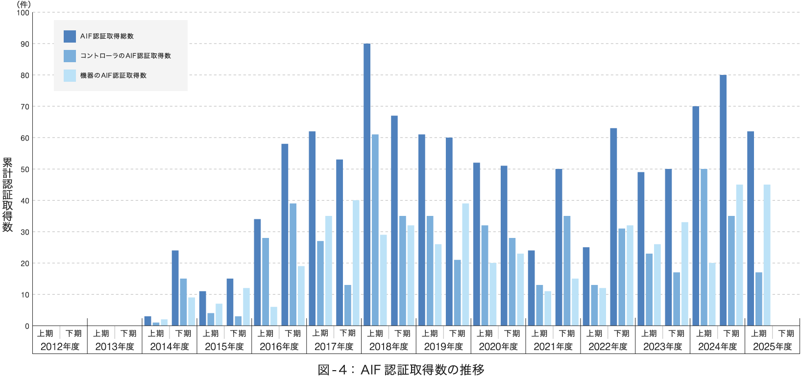 図-4は、AIF認証取得総数と、その内訳として機器のAIF認証取得数およびコントローラのAIF認証取得数を年度ごとに示しています。