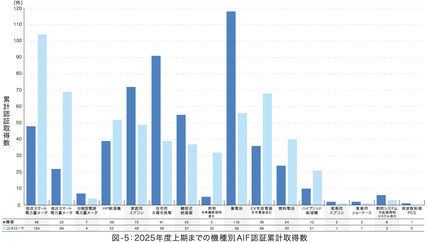 図-5は、2024年度上期までの機器およびコントローラのAIF認証取得数を機種別に示しています。