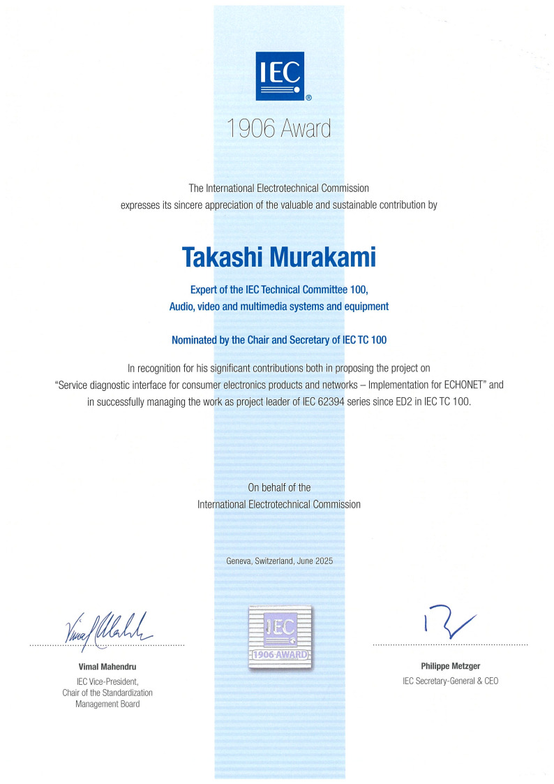 この度、村上技術委員長(パナソニック株式会社)がこれまでのECHONET Liteの国際標準化に対する貢献を認められ国際電気標準会議(IEC)より「IEC1906賞*¹」を受賞されました。