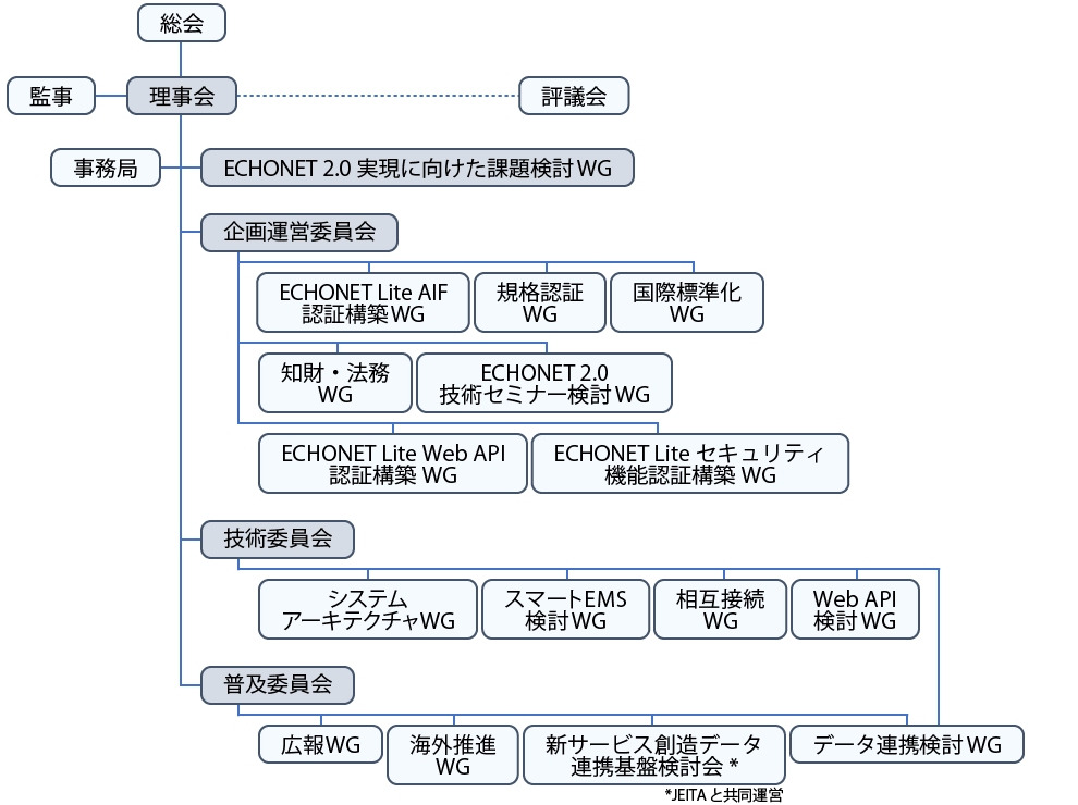 組織運営に関する企画、予算管理、総会およびフォーラムの開催など、エコーネットコンソーシアム全体を効率的かつ円滑に運営するための総合的な活動を行います。また、各委員会およびWGの組織化や全体の運営調整を行います。
